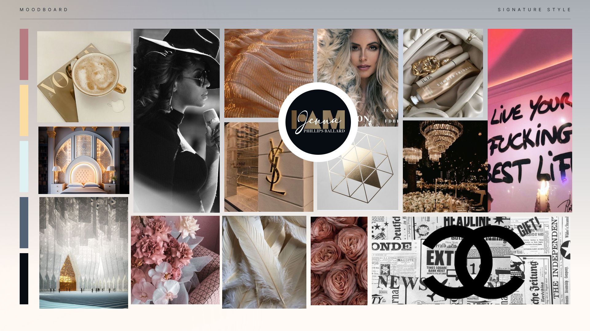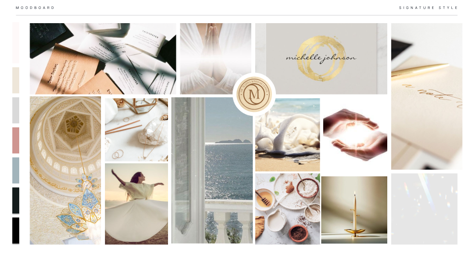 Your Signature Brand Style moodboard captures the essence of your brand. Each photo, icon, symbol, shape, and aesthetic, all in similar colors and tones, conveys a unique meaning that sets the foundation for your brand's identity and feeling.